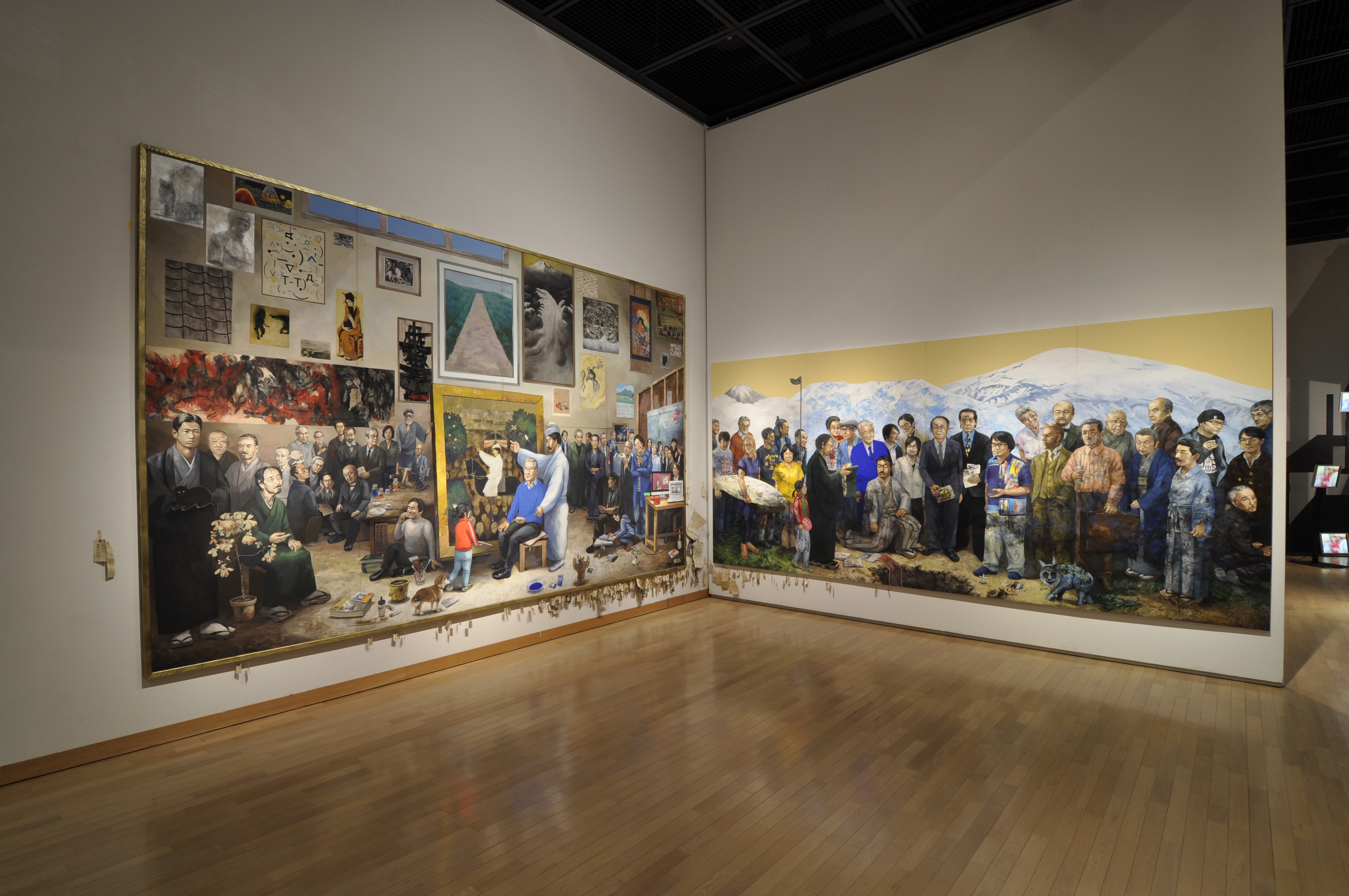 The two paintings refer to a composition from Gustave Courbet’s two works, “A Burial at Ornans” and “The Painter’s Studio,” in order to compare the structure of modern art history between the West and my home country, Japan. In my works, all the figures of Courbet’s works were replaced with famous people from the modern and contemporary Japanese art industry. I portrayed artists, historians, critics, and other existing figures, both dead and alive, as characters in my works. In addition, to ask permission to use their portrait rights, I sent them letters.