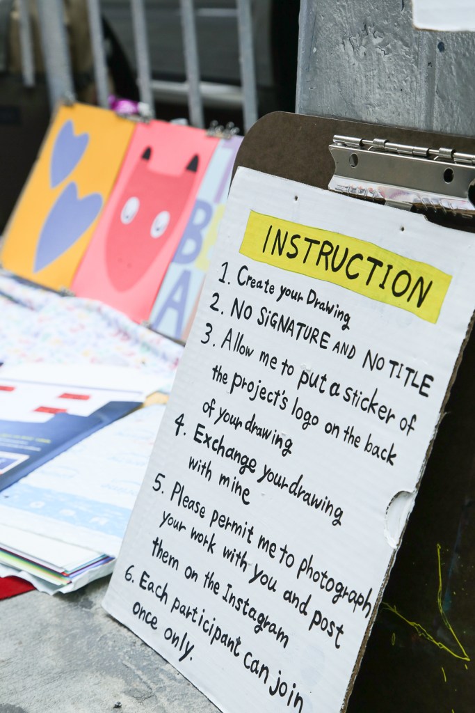 “Paint for Me!” is a communicative performance + workshop by artist Tomoko Hisamatsu that investigates strategies for the distribution of artwork without the transactional use of money. The artist displays her drawings and art materials and invite the public to interact with these items. At the same time the public is encouraged to make their own art works, resulting in a bartering process between both parties. There are rules however to follow, such as no signature and no title allowed on the artworks, to highlight how value and equality are at play and can possibly be re-negotiated.