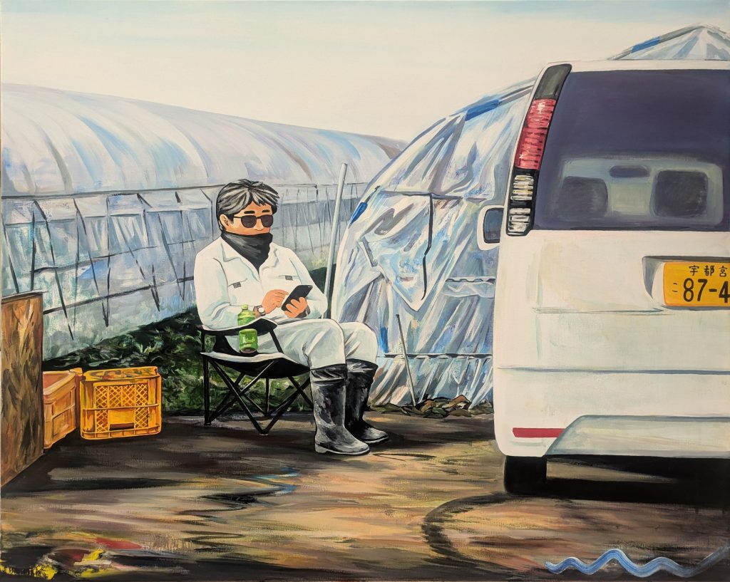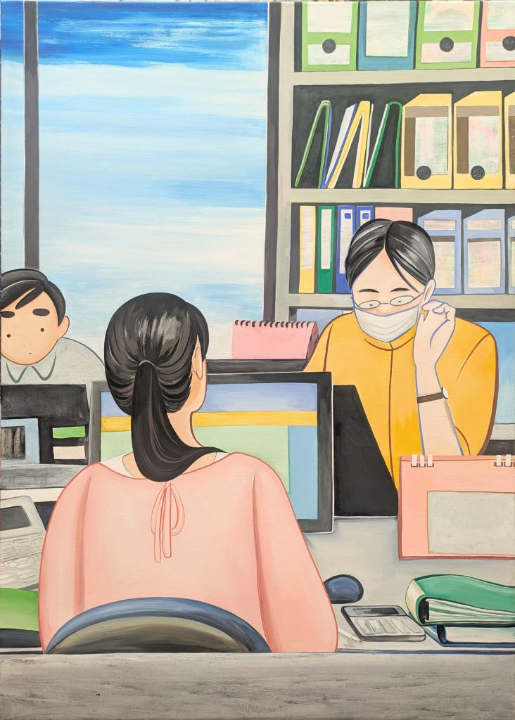 The exhibition features paintings focusing on the lives, labor, and food of ordinary people living within the geographical conditions of Japan. Through research and sketches conducted in places such as an accounting office, a corporate cafeteria, and a strawberry farm, the works depict various extracted scenes. I hope these pieces encourage viewers to pause and reflect on the familiar landscapes around them, deepening their thoughts on the society and culture we live in.